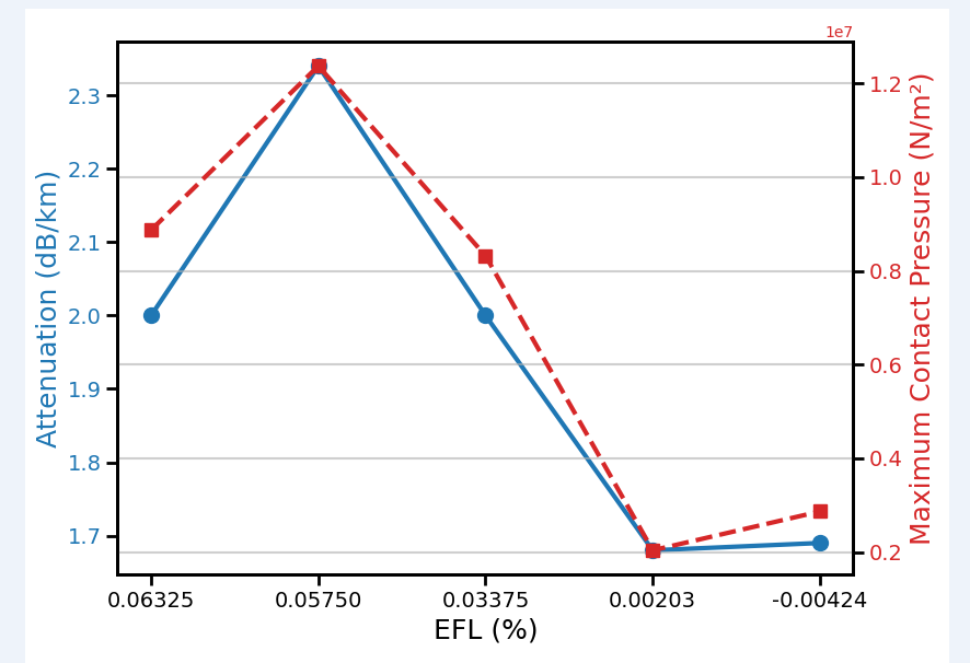 The model showed strong correlation with measured attenuation data from manufactured samples. Simulations accurately predicted how both excess fiber length (EFL) and inner-diameter variation affected stress distribution and optical performance.